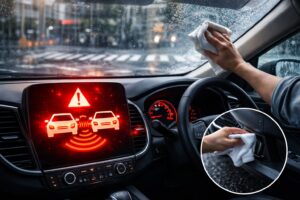 自動ブレーキが急に鳴るとき、最初に試したいのが「センサーまわりの掃除」です。カメラはフロントガラス越しに前を見ているので、雨のあとや朝の結露で水滴・くもりが残るだけでも反応が増えることがあります。